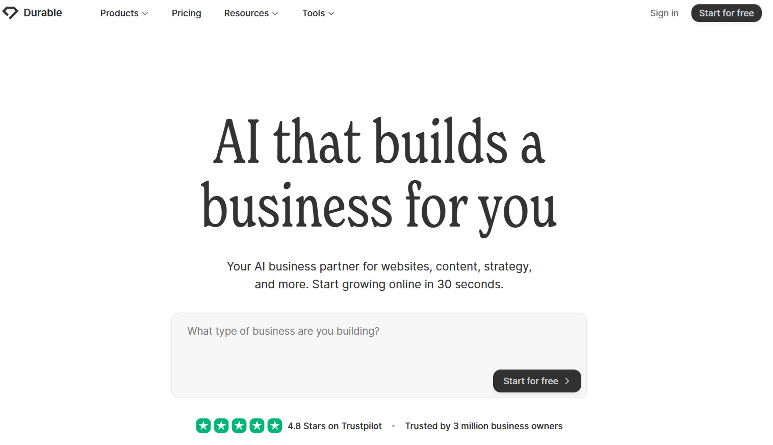 | Durable | $12/month | – 30-second website creation – AI content strategist – CRM integration – Invoicing tools | – Built-in optimization – AI-written meta content – Weekly blog generation | – Fast creation – No coding needed – Business tools included | – Limited customization – Simple designs – No blog function |
