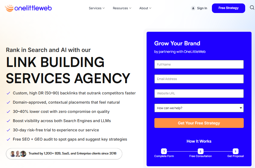 | OneLittleWeb | $2,500 | Link building campaigns, guest posting, niche edits, competitor backlink analysis, SEO support | High authority link building with DA 50 to 90 backlinks and SaaS, B2B, AI focus | SMB to Mid Market, growth-stage startups |
