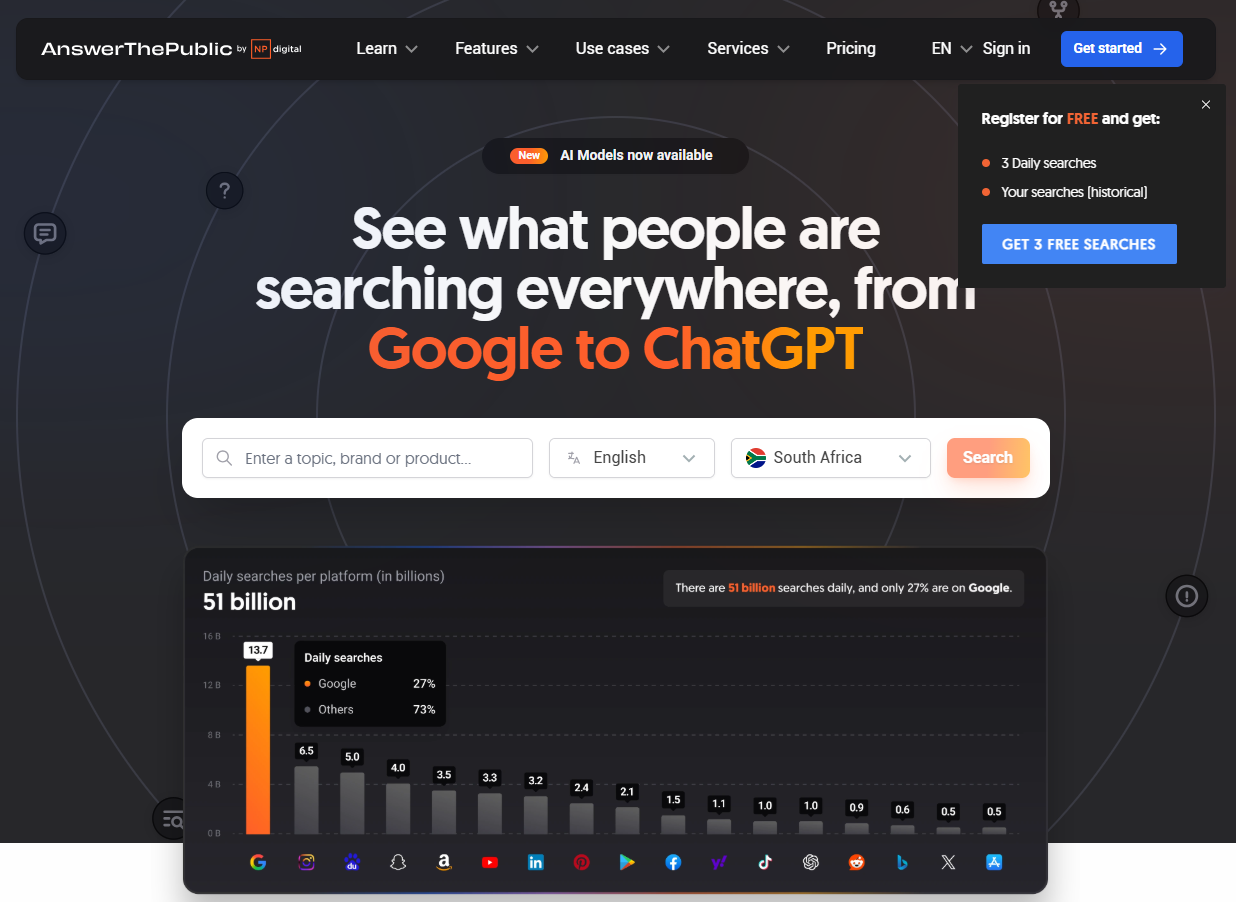 | AnswerThePublic | Question Discovery | Question maps Preposition analysis Visual mind maps Related terms | Free: 3 searches/day Paid: $11199/month | Live user questions Visual format Easy to use | Limited free version No competition metrics No competitor analysis |
