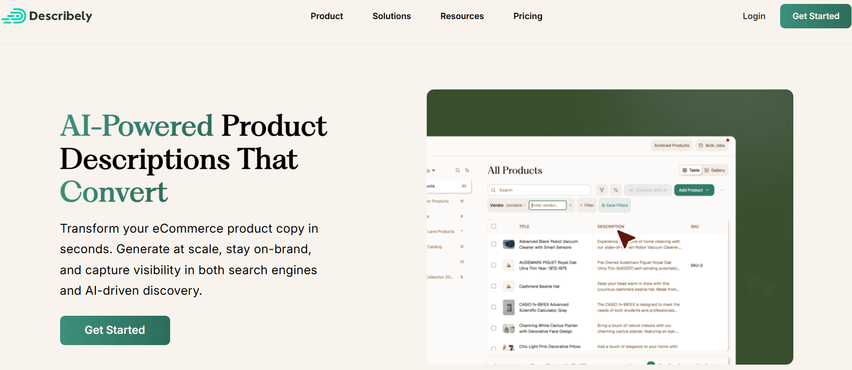 | Describely | Product Description Generation | Content Rules Data enrichment Bulk generation SEO optimization | Payasyougo | Built for eCommerce Bulk processing Platform integration | Platform dependent Setup time needed Limited free plan |