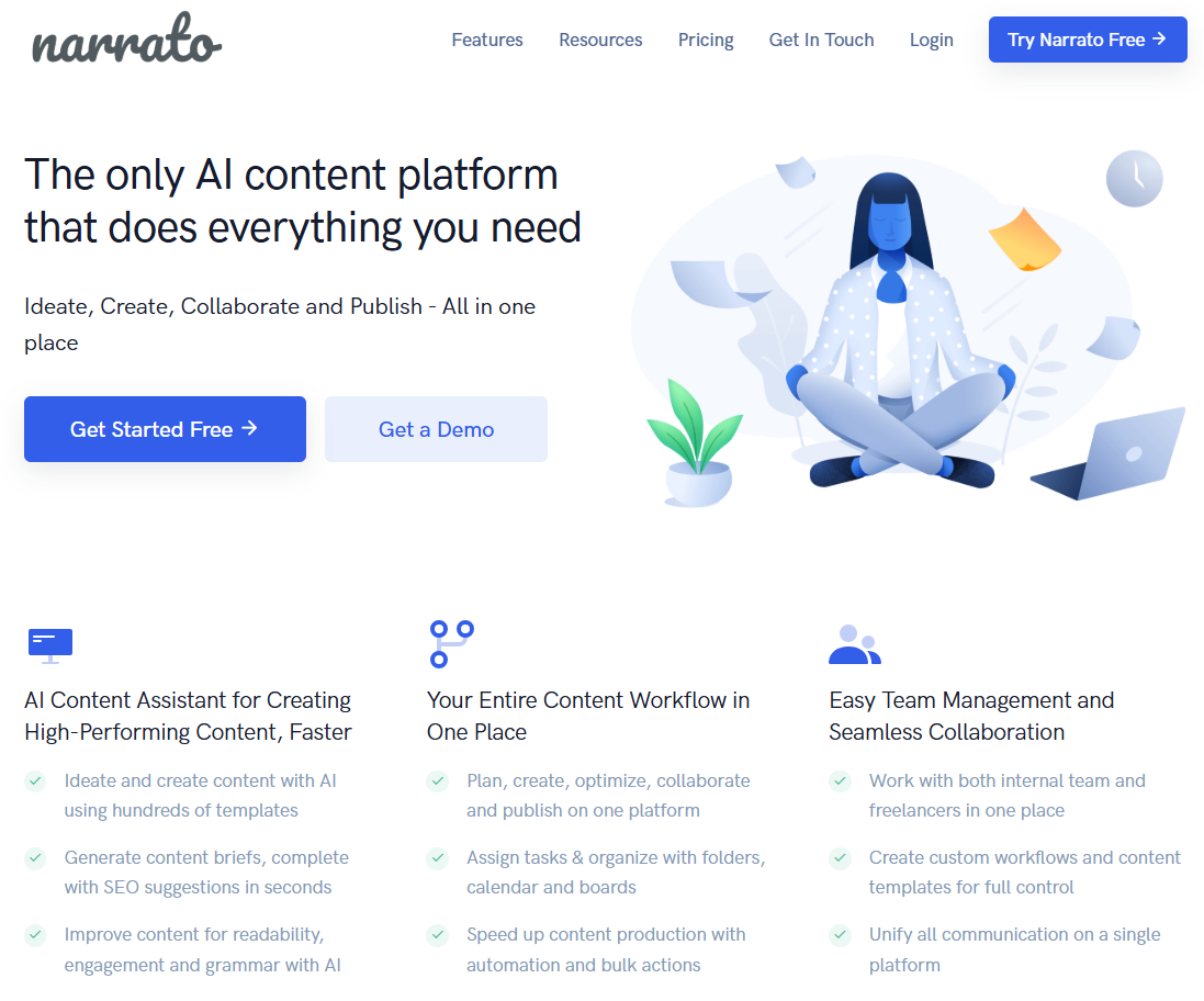 | Narrato | Content Workflow Management | AI Content Assistant Workflow automation SEO tools Publishing automation | $48/month (Pro) $Custom (Business) | Complete workflow solution Bulk generation Publishing automation | Few integrations Takes time to learn Short trial period |