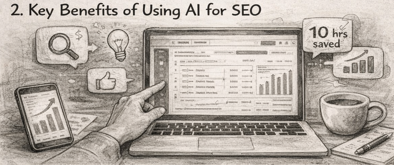 On top of that, it brings advantages way beyond just saving time. AI tools excel at data analysis, content optimization, and technical audits. These tools easily scale up for big websites and give analytical insights that help you keep up with trends.