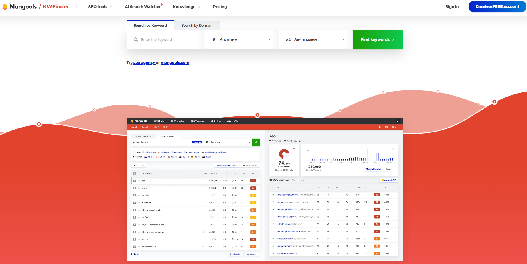 KWFinder stands out in the AI SEO world as a tool that helps you find long-tail keywords with low competition. This platform has become popular since 2014 as part of the Mangools suite of SEO tools. Users love its straightforward approach and accurate keyword difficulty metrics.