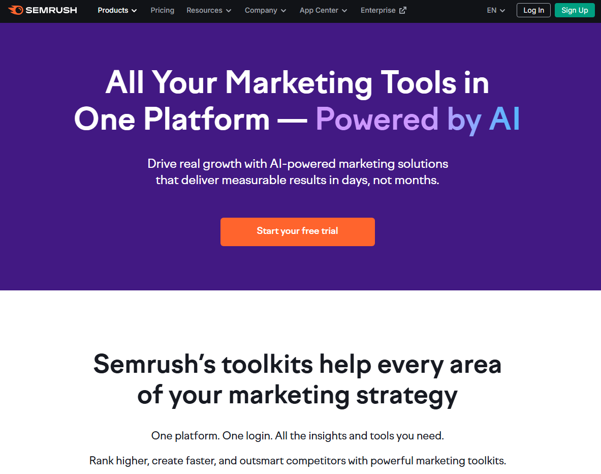 Semrush works best for marketers who want an integrated approach to SEO, content marketing, and competitive analysis. Its sophisticated AI technology turns complex data into useful insights.
